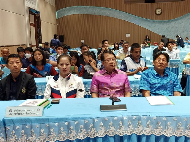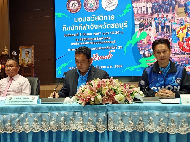 # เวลา 15.30 นาฬิกา วันอังคารที่ 5 มีนาคม พ.ศ.2567 ณ ห้องประชุมแก้วเจ้าจอม สำนักงานองค์การบริหารส่วนจังหวัดชลบุรี นายอำนาจ เจริญศรี รองผู้ว่าราชการจังหวัดชลบุรี ประธานพิธีให้โอวาทและมอบเงินสวัสดิการให้กับคณะนักกีฬาจังหวัดชลบุรีในโอกาสเดินทางเข้าร่วมการแข่งขันกีฬาเยาวชนแห่งชาติ ครั้งที่ 39 ” ประจำปี 2567 ” ราชบุรีเกมส์ ” โดยมีนายสัมฤทธิ์ พงษ์ซิรัตน์ เลขาธิการสมาคมกีฬาแห่งจังหวัดชลบุรี กล่าวรายงาน มี นายสนธยา คุณปลื้ม นายกสมาคมกีฬาแห่งจังหวัดชลบุรี นายพันธ์ศักดิ์ เกตุวัตถา รองนายกองค์การบริหารส่วนจังหวัดชลบุรีและผู้แทนผู้อำนวยการสำนักงานการกีฬาจังหวัดชลบุรี เข้าร่วม